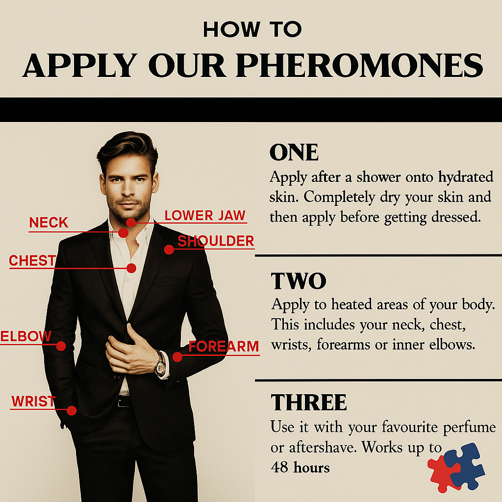 Nanieść niewielką ilość feromonu (2 – 3 krople) na nadgarstki, za uszy lub na szyję na czystą skórę.